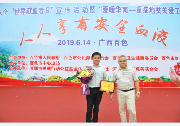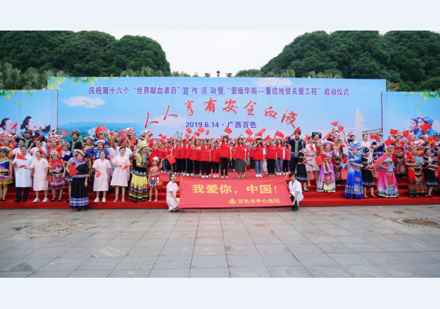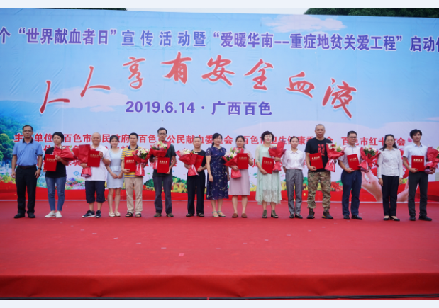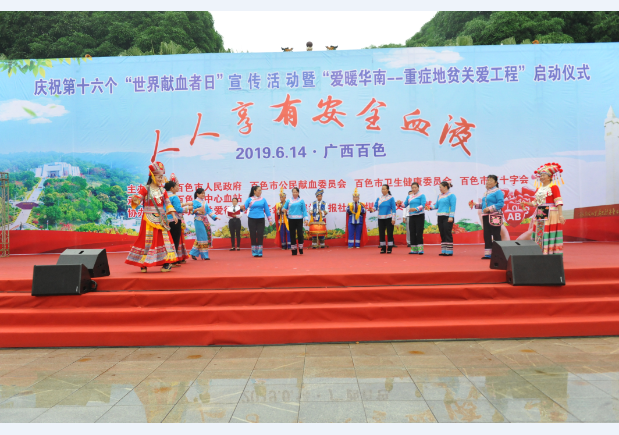 “无偿献血诚可贵,助人为乐品更高。血脉相连情悠悠,人道博爱无尽头……”来自百色的广西山歌王“小刘三姐”张人元甜美朴实的歌声在红城百色唱响。2019年6月14日上午,由百色市人民政府、百色市公民献血委员会、百色市卫生健康委员会、百色市红十字会联合主办,百色市中心血站承办的百色市庆祝第十六个世界献血者日宣传活动在百色市森林公园举行。市人民政府副市长吴军军、市人民政府副秘书长万立明等领导出席活动。万立明主持活动仪式,吴军军为活动致辞,市卫健委副主任黄再波现场宣读了表彰决定,并由吴军军、广西血液中心副主任梁汉武、市红十字会专职副会长马桂荣等领导分别为获得“全国无偿献血先进城市奖”、“全国无偿献血促进奖”、“全国无偿献血奉献奖”代表颁奖。