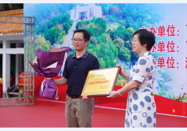 广西血液中心副主任梁汉武为广西幼儿师范高等专科学校颁发2016-2017年度全国无偿献血促进奖