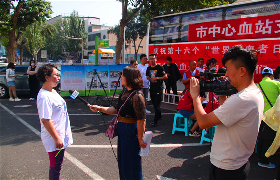 我站也邀请到鄂尔多斯市电视台百姓直通车、健康鄂尔多斯栏目组,鄂尔多斯日报、晚报记者对此次活动进行了宣传报道。鄂尔多斯市中心血站副站长杨伊娜接受了媒体记者的采访,并详细讲解了无偿献血的相关知识及献血的意义等。