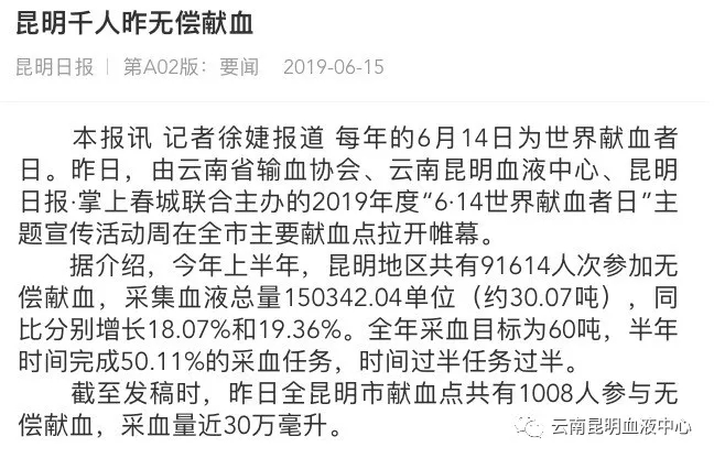 据介绍,近年来,云南昆明血液中心围绕“抓班子、带队伍、转作风、强宣传、促采量、保质量”思路,立足昆明、服务全省,跨越式提升采供血服务能力,同步推进机制改革和管理创新,献血人数和血液采量快速递增,改善了医疗机构长期缺血的问题。