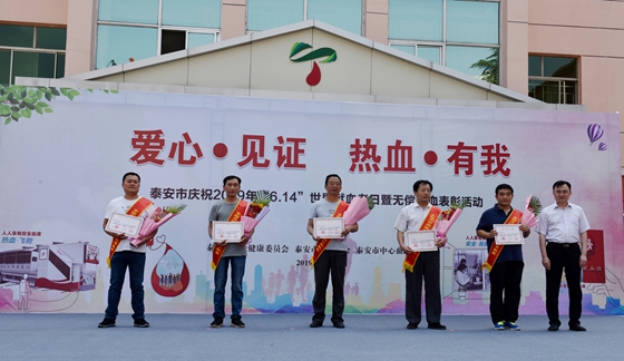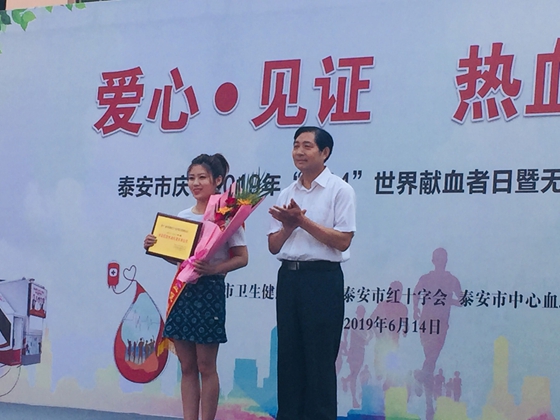 2019年6月14日是第16个世界献血者日,为感谢广大无偿献血者的无私奉献,弘扬救死扶伤的人道主义精神,保障临床血液供应安全,泰安市卫生健康委、市红十字会和市中心血站联合举办了庆祝2019年“6.14”世界献血者日暨无偿献血表彰活动。