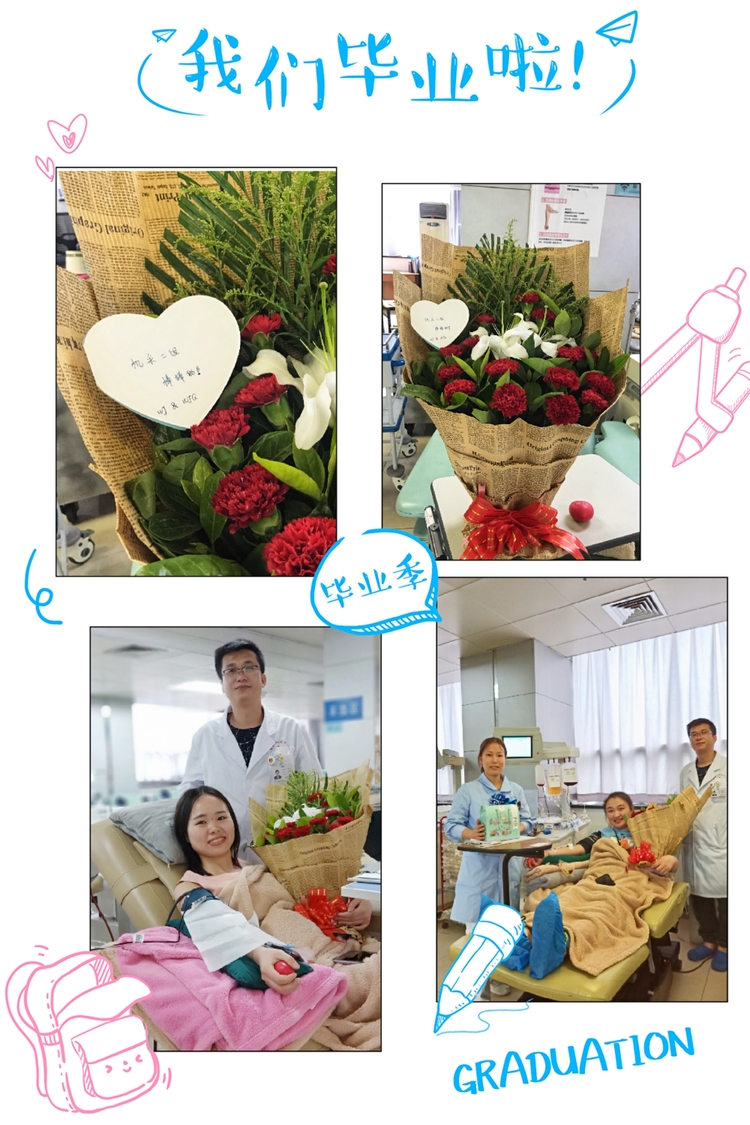 原来两位美女都是机采二组的固定献血者,都是重庆医科大学的医学生,在即将到来的毕业季,都将告别学校走上工作岗位,今天特意来表示对工作人员的感谢,感谢这么多年来的相识相知,感谢这份美丽而温暖的缘分!她们大学从第一次来机采科献血小板,到后来一直坚持定期血小板捐献,分别捐献了20个治疗量和17个治疗量的血小板以及1000毫升的全血,为病患带去了生的希望。今天她们即将要告别深爱的校园走向社会,在这最美毕业季里我们送上真挚的祝福,祝两位善良的美女,工作顺利,开心幸福,带着她们的爱心走向新的城市和岗位!