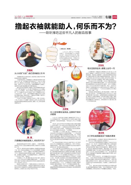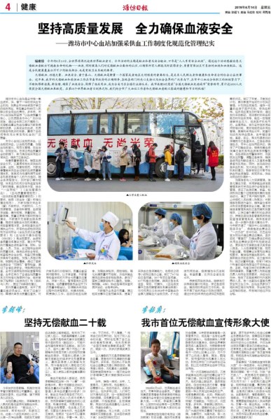 “潍坊市中心血站微信公众号”作为潍坊市中心血站自己的发声平台,自5月下旬起,开启主题宣传预热模式,发布主题宣传海报、公益广告视频、讲述献血英雄故事。6月10日-15日,潍坊人民广播电台交通广播名牌栏目"幸运闪大灯—世界献血者日主题闪灯周",以互动游戏的形式,向听友介绍世界献血者日。6月11日,一场联合潍坊市广播电视台共同策划举办的“今天我为无偿献血代言”公益活动,正式全面启动媒体主题系列宣传活动。媒体人走进血站,零距离接触相关业务工作流程,与献血英雄面对面交流,亲身体验献血过程,并用镜头逐一记录活动行程。6月12日,《潍坊晚报》以“从血管到血管 经过层层筛查”为题,用整版文章引导读者走血站检验科,探寻血液检验微观奥秘。6月13日,《潍坊城市周报》以“撸起衣袖就能助人,何乐而不为?”为主题专版,讲述平凡人的献血故事。同日,血站血液采集部及血液检测部的部门负责人,坐客潍坊人民广播电台《党风政风行风在线》栏目,与主持人及听众进行在线交流。6月14日,党报《潍坊日报》以整版篇幅介绍潍坊市中心血站加强采供血工作制度化规范管理,确保临床用血安全。同日,血站宣传科室负责人与潍坊市无偿献血宣传形象大使李韶庚、献血达人李朝峰一起坐客潍坊人民广播电台《一起做公益》栏目,与主持人一起交流关于无偿献血的话题......同期,山东大众网、山东网易在世界献血者日期间不仅进行专题采访,还制作了主题网页,今日头条新闻客户端、凤凰网等网络媒体及时转发相关报道。