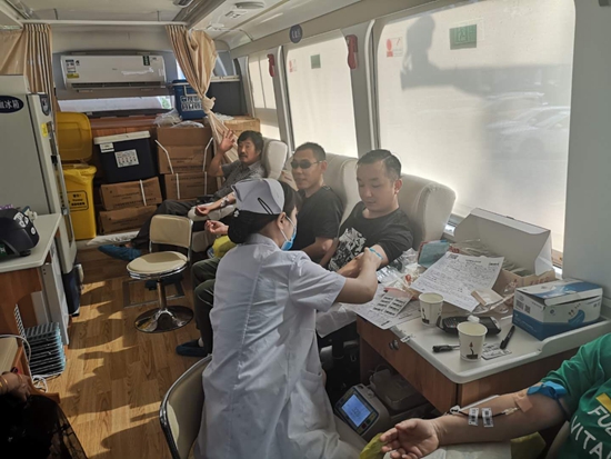 活动现场气氛热烈,大家热情地挤满了两张长桌,有几位同志干脆或靠着采血车,或靠着墙壁填写着表格。大家有条不紊的填表,排队,初筛,采血,每位无偿献血者的脸上都洋溢着笑脸。