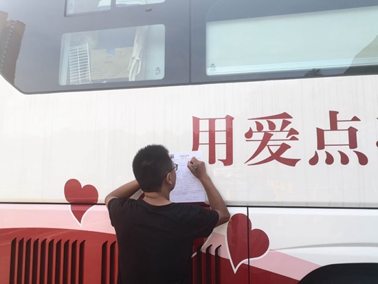 为了节约时间,爱心献血者爬在车上填写征询表