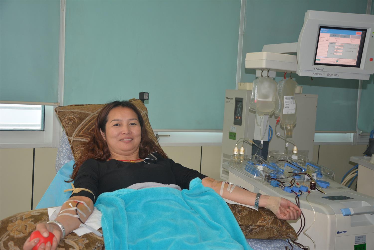 在众姐妹中,排行第五的严红娥献血量最多,图为她在捐献单采血小板。(摄于2014年)