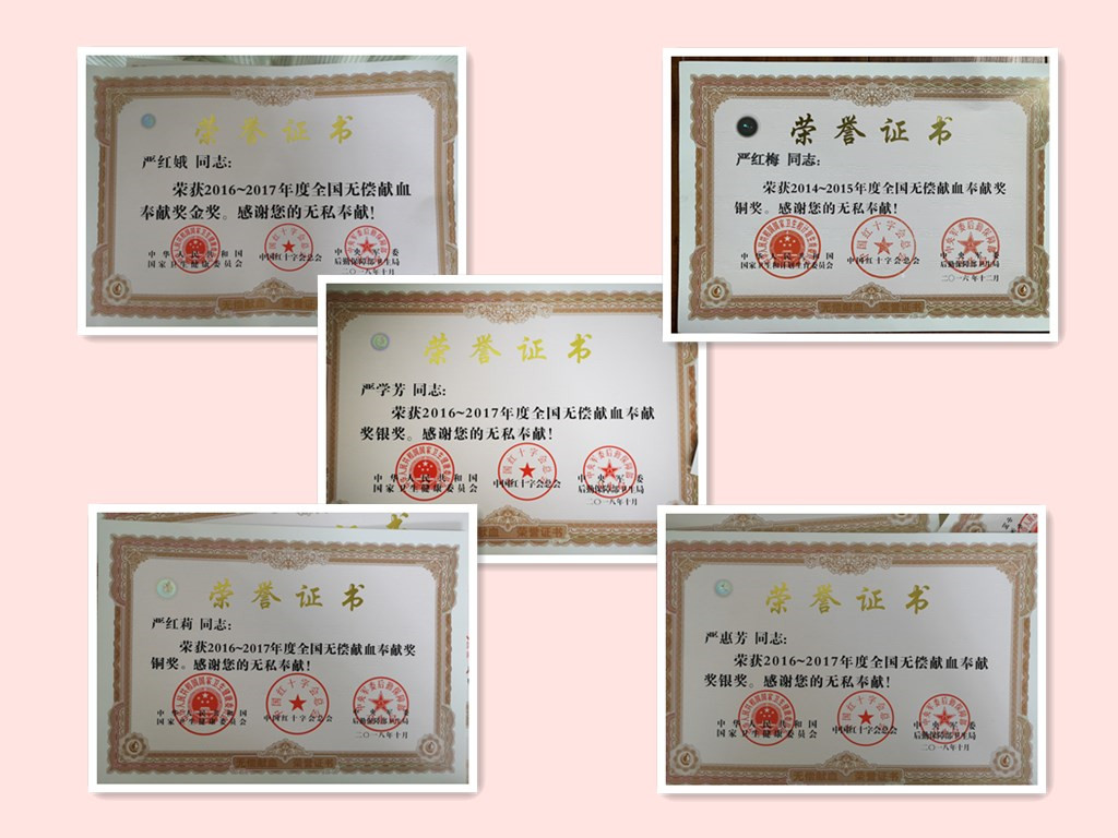 讲得多了,便渐渐有了效果。严红娥的亲戚朋友和同事都先后加入无偿献血者队伍,并成为固定献血者。她的大姐严学芳坚持献血19次,每次都主动要求献400毫升;二姐严惠芳,已经献血16次,6100毫升。她俩是2012-2013年度“全国无偿献血奉献奖铜奖”和2016-2017年度“全国无偿献血奉献奖银奖”获得者。她的四姐严红莉,至今献血15次,共4900毫升,是2016-2017年度“全国无偿献血奉献奖铜奖”获得者;六妹严红梅,至今献血15次,共5100毫升,是2014-2015年度“全国无偿献血奉献奖铜奖”获得者。