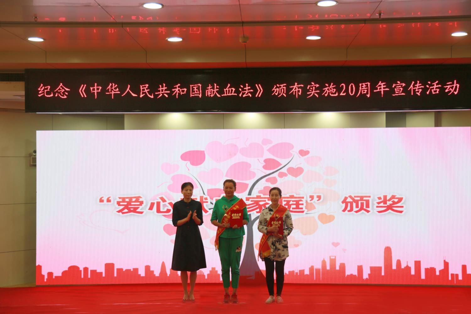 图为严红娥(中)在孝感市首届“爱心献血家庭”颁奖台上。
