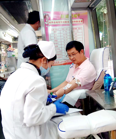 山东能源肥矿集团曹庄煤矿党委副书记马成带头献血