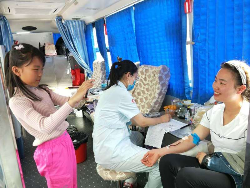 陈英凤女士顺利通过了献血前的核查、体检、初筛项目。她愉快的带着孩子走向采血区。穿刺非常顺利,看着鲜红色血液流进采血袋,女儿俏皮地说:“妈妈我可以采访一下你吗?”妈妈自豪的回答:“可以呀!”“妈妈你疼吗?献血有什么好处呀?”“不疼,献血可以把我身体里陈旧的血液抽出去,刺激我骨髓造新鲜血液,我的身体就会更健康。我的这一袋血液还可以挽救一位生命垂危的病人。”