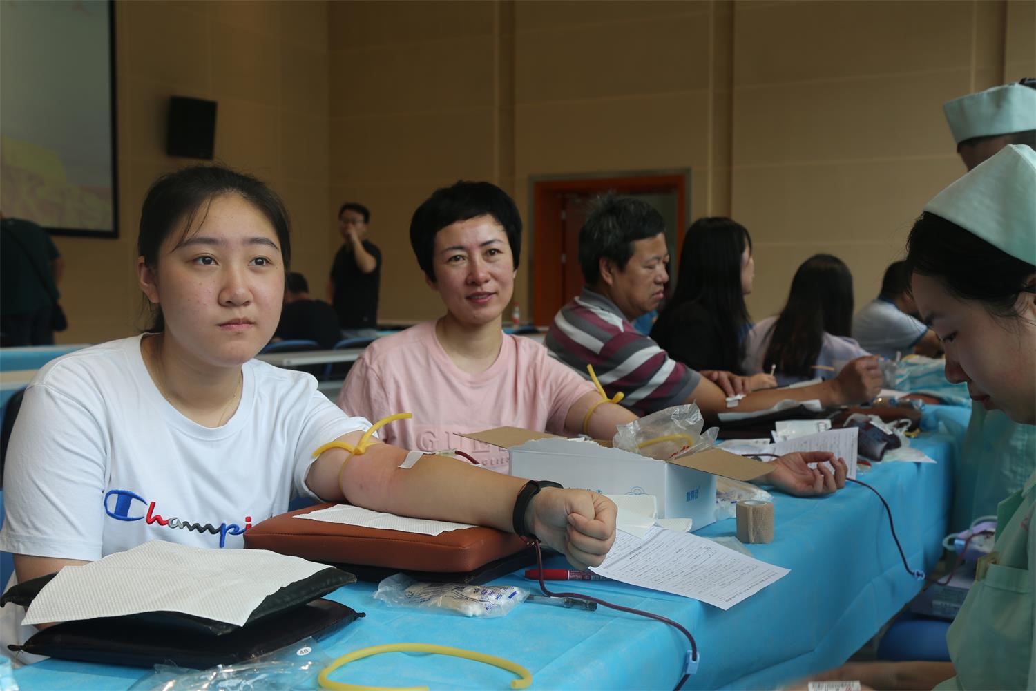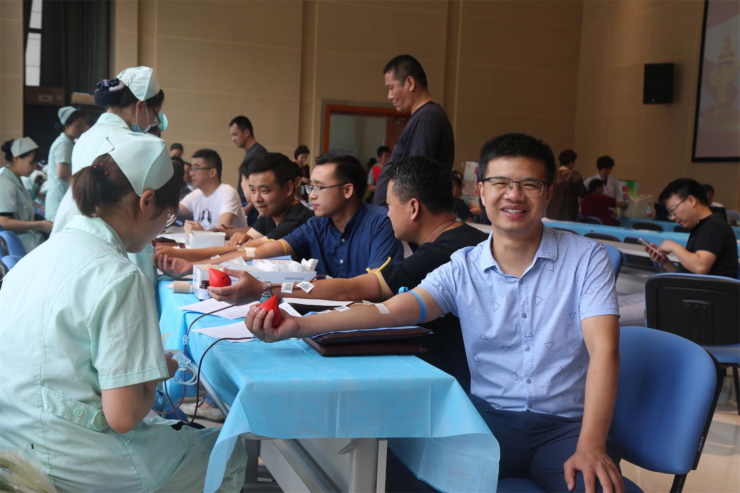 当日上午8点半,孝感市直机关及各单位的无偿献血者们来到市民之家一楼市民大讲堂,在志愿者和医护人员指引下,有序地填表、体检、化验、献血。