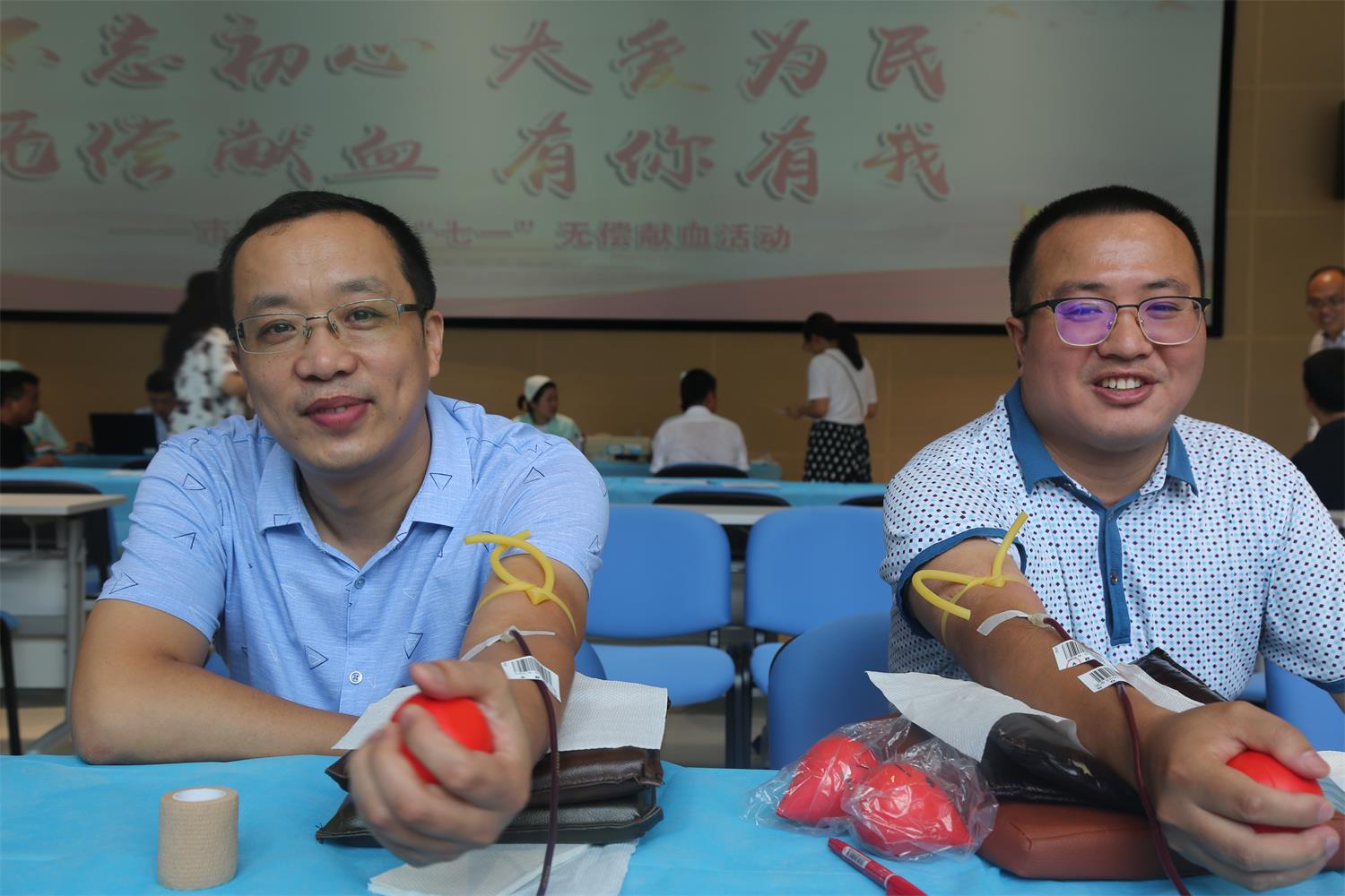 市委巡察办副主任梁军也是当天的献血者之一,他已经记不清自己的献血次数了。为他采血的,是市中心血站献血服务科副主任沈磊。一见面,他俩就拉起了家常。原来,2006年,梁主任第一次献血,采血者就是刚到血站上班的沈磊。时移物换,沈磊一直坚守在采血一线,见证了众多献血者不改的初心。