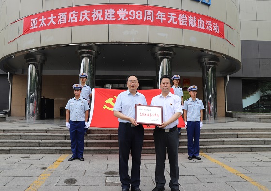 6月28日,在建党98周年纪念日即将来临之际,石家庄亚太大酒店联合石家庄市公安消防支队富强大街中队、裕华路街道办事处、裕华区公安分局裕华路派出所、青园街第一社区、第四社区以“不忘初心、牢记使命,无偿献血、奉献爱心”为主题, 举办建党98周年无偿献血活动。亚太大酒店党委书记、总经理邓定,常务副总经理曹震川,副总经理武建辉,党委专职副书记、副总经理刘子娇,河北省血液中心党委书记、主任戚海,河北省血液中心副主任陈莉及石家庄市消防支队、裕华街道办事处以及青园街第一社区、第四社区负责同志参加了此次活动。