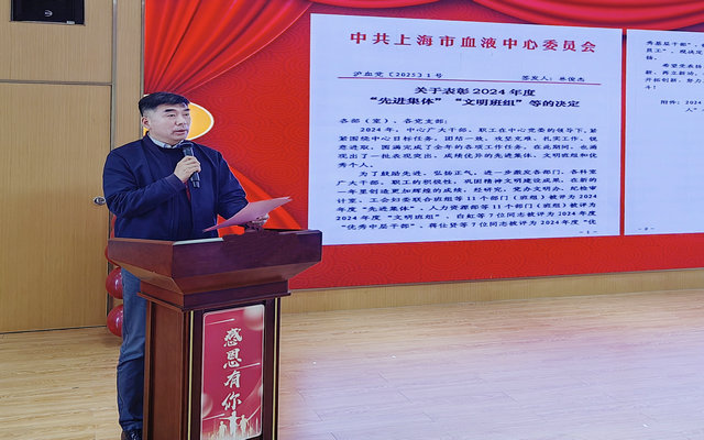 大屏上滚动展示着2024年度中心先进集体、文明班组、优秀个人及献血职工的风采。每一个获奖集体、每一位获奖者的名字背后,都承载着他们在各自岗位上的辛勤耕耘与默默付出。他们或是在采供血一线默默奉献,用真心真情架起献血者与用血者之间爱的桥梁;或是忙碌在质量、检验岗位,严谨认真确保血液安全与质量;或是在后勤服务岗位上兢兢业业,为中心的顺利运转提供坚实保障;或是凭借科研团队的协作精神,推动中心科研工作不断向前发展;或是在行政岗位勤勉工作,尽职尽心为基层一线服务。 中心党委书记林俊杰宣读了《关于表彰2024年度“先进集体”“文明班组”等的决定》,号召中心全体党员、干部、职工学习先进、赶超先进,干字当头、奋勇争先。中心党政领导为获奖集体、个人颁奖。