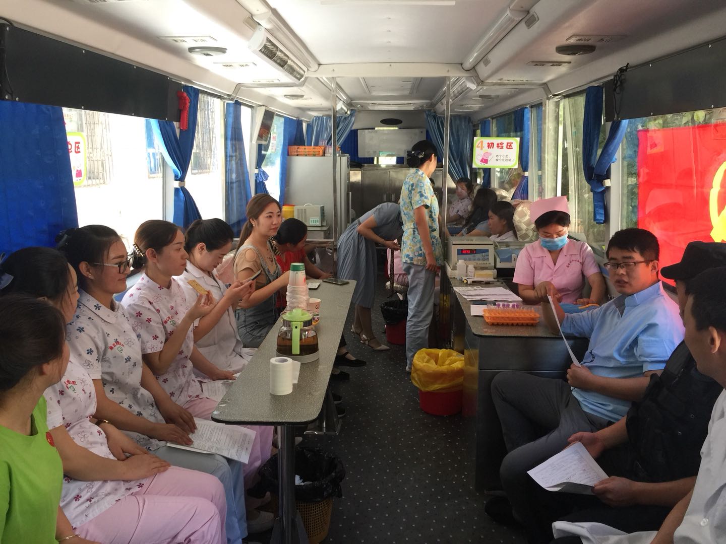 停靠在医院健康管理中心门前的采血车上,参加无偿献血的医务人员秩序井然地在工作人员的指导下,认真填写献血登记表、测量血压、抽血化验,经血液检验合格后开始献血。