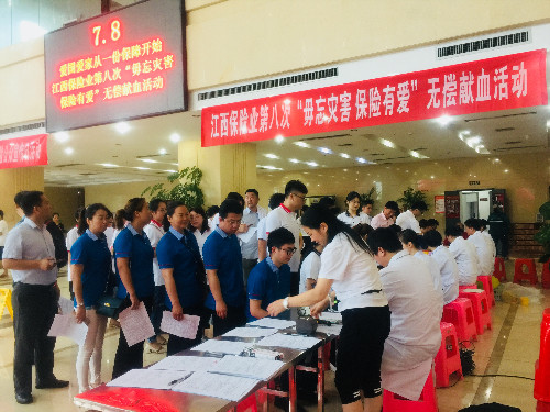 爱国爱家,从一份保障开始。7月8日是保险公众宣传日,当天上午, 由江西省保险行业协会联合江西省血液中心主办的“毋忘灾害、保险有爱”江西保险业第八次爱心献血大型活动在浦发大厦一楼大厅举行。江西省血液中心党委书记、副主任李秀珍来到活动现场看望和慰问献血者。来自在昌30多家保险公司的保险人员参加了当天活动。经过咨询、体检,最终152人献血成功,累计无偿献血量40300毫升。