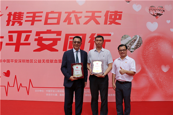 深圳市血液中心党总支书记卢亮、平安人寿深圳分公司业务总监刘利峰、中国平安深圳地区品牌总监刁俊文为平安血缘家族成员代表进行表彰,平安人寿深圳分公司和深圳市血液中心希望社会上更多的人关注这些默默无闻、籍籍无名的献血热心人士。