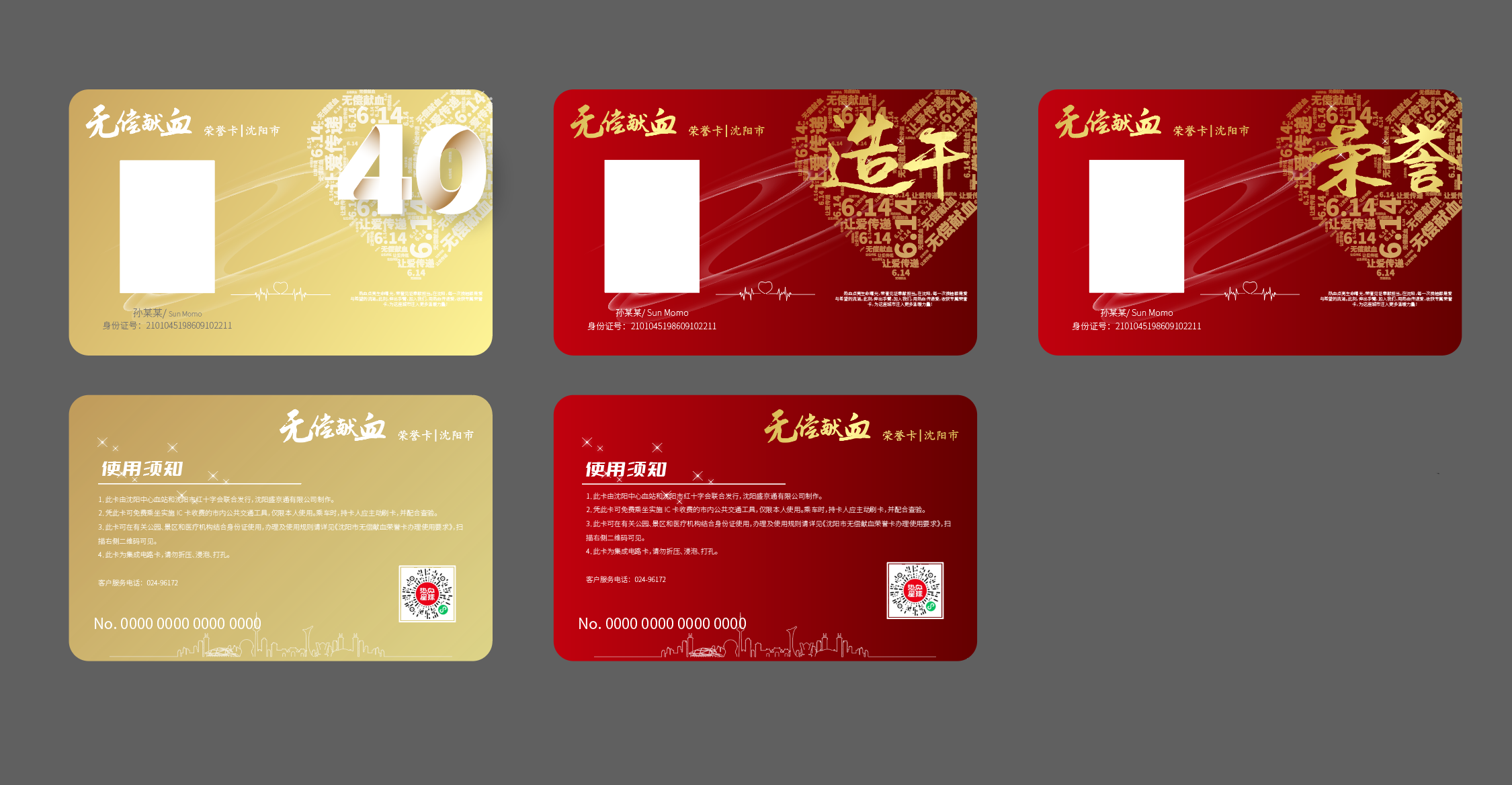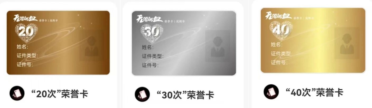 1. 电子卡:献血达二十次及以上的献血者,可经沈阳中心血站微信公众号按照献血次数申办“沈阳市无偿献血荣誉卡”(电子卡),具体卡级分为“20次”“30次”“40次”等三种。