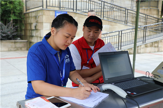(陈玉娟在志愿者的帮助下做献血登记)