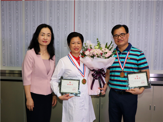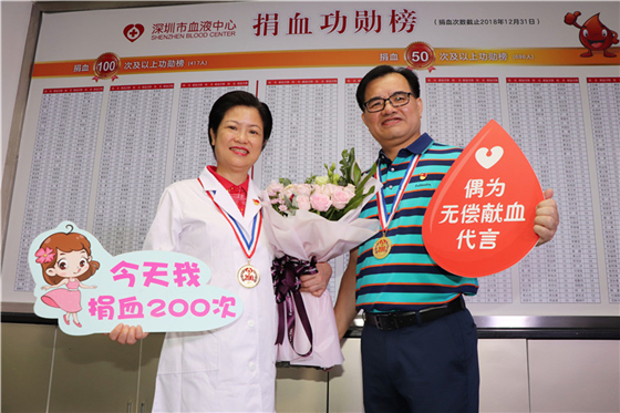 7月12日一早,深圳市红十字会常务副会长兼秘书长张英姬专程前来慰问并亲手将 200 次献血的纪念奖章颁发给卢亮及李宝瑜。