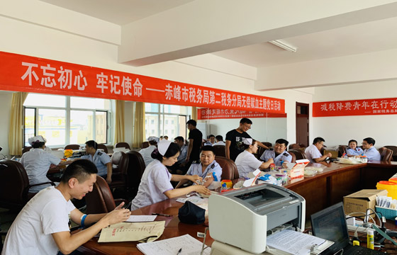 国家税务总局赤峰市税务局第二税务分局开展“不忘初心 牢记使命”无偿献血主题党日活动。广大党员干部热烈响应、踊跃参与、率先垂范,用实际行动践行了赤峰税务二分局税务干部敢于担当、敢于奉献、热心公益、关爱生命的高尚情怀。
