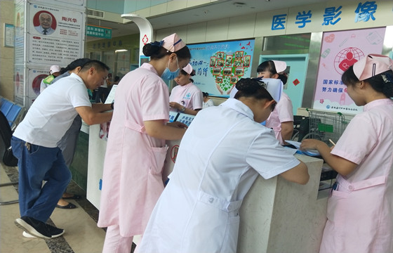 八点还未到,医院的一楼大厅就热闹纷繁。走进一楼,医护人员身着整洁的白色大褂排队填表、化验。当走近他们,还可以听见他们在感叹自己终于被别人量血压、化验了,忙于救助患者的他们,常常顾及不到自己的身体。