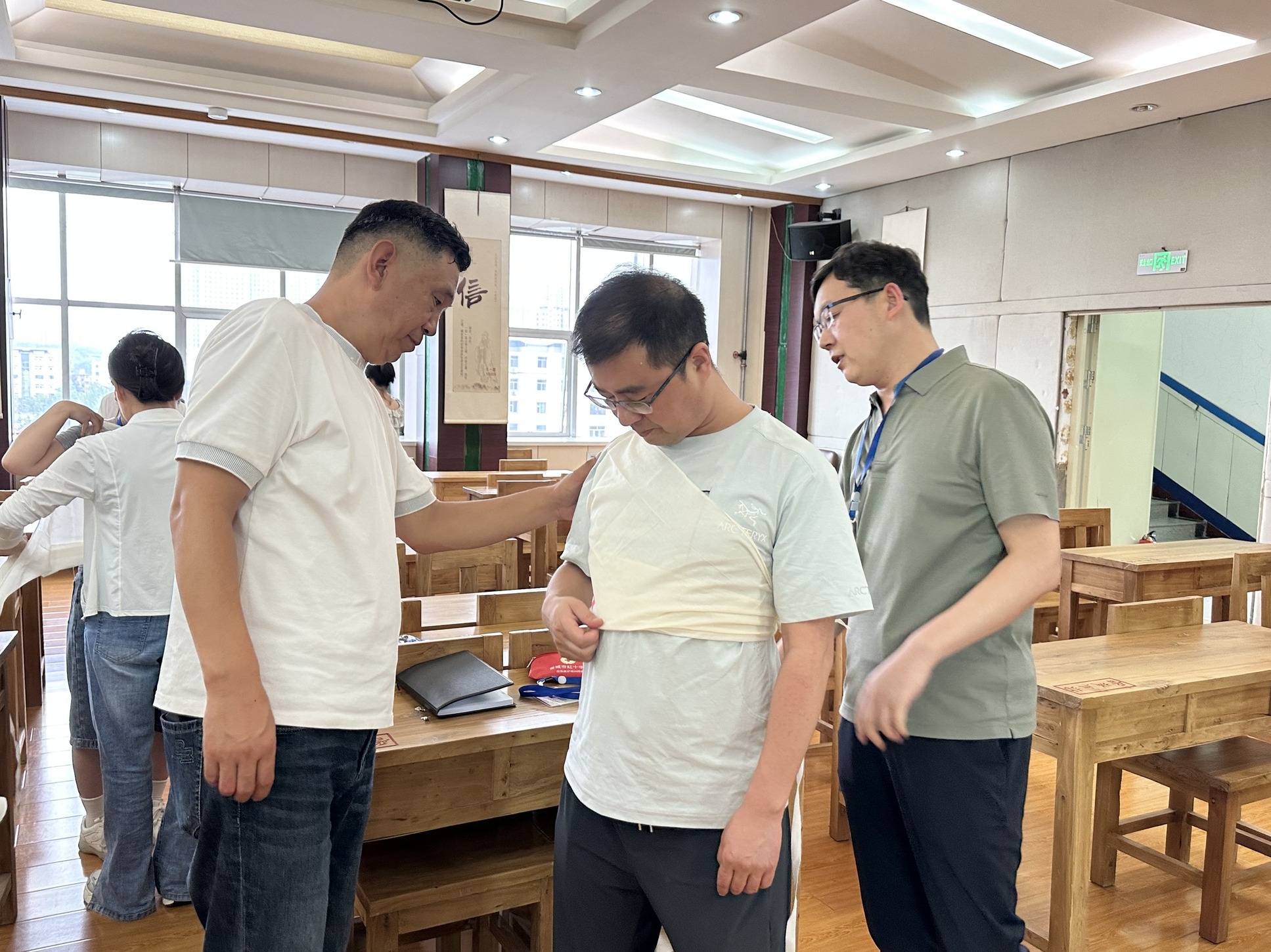 在实操环节,培训老师利用模拟人进行现场演示,从评估环境、判断意识、呼叫救援,到胸外按压、开放气道、人工呼吸、AED开箱、电极片粘贴、语音提示操作全流程,并围绕不同的外伤部位,详细讲解了止血、包扎、固定、搬运等操作要领。演示结束后,大家纷纷踊跃进行实操练习,培训老师在一旁耐心指导,纠正不规范动作,确保大家都能掌握正确的操作方法。