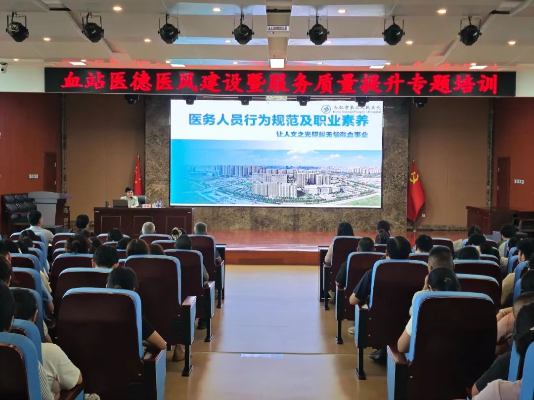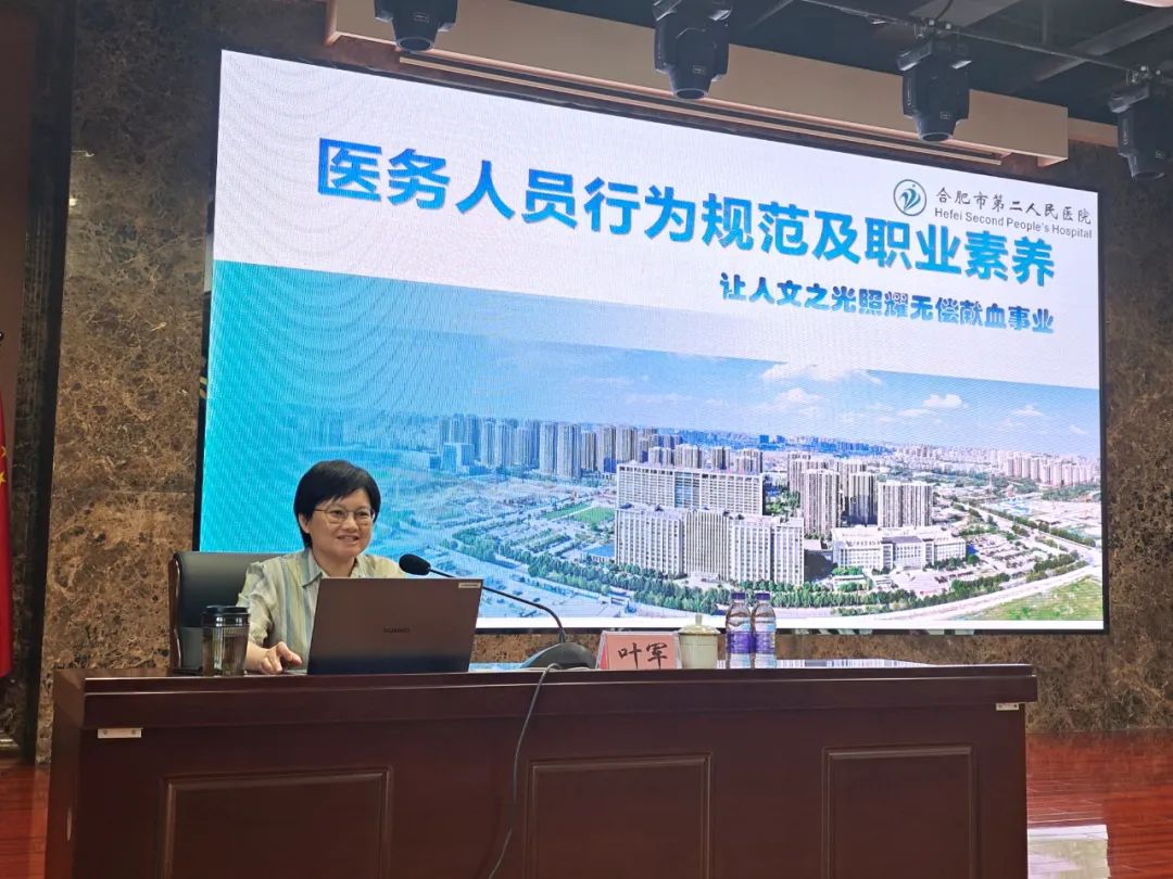 为深入贯彻“以献血者为中心”的服务理念,落实省、市卫生健康委关于提升无偿献血服务质量、改进工作作风的要求,持续加强血站医德医风建设,8月3日上午,安徽省血液中心组织开展面向全体职工的“血站医德医风建设暨服务质量提升”专题培训活动。本次培训特别邀请合肥市第二人民医院叶军主任进行授课,培训会由中心党委副书记刘梅主持。