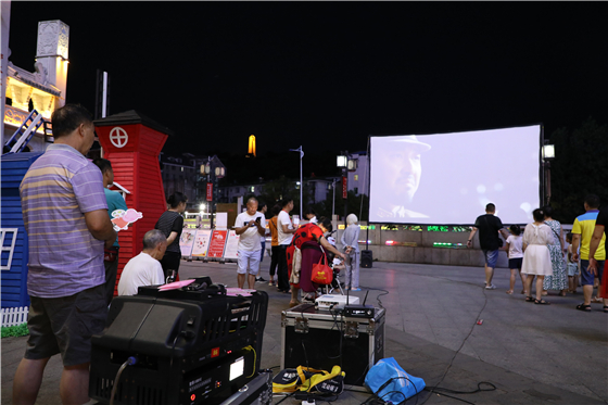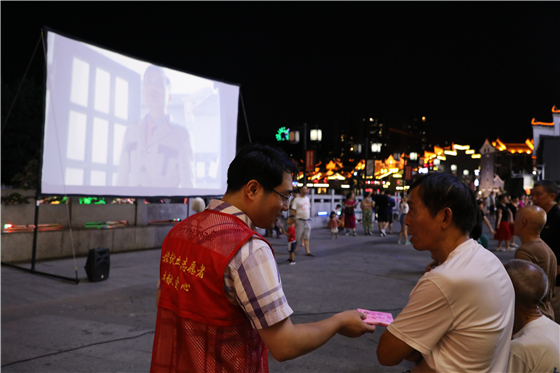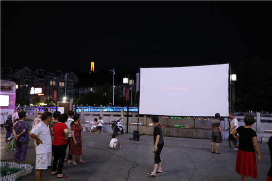 通讯员(李智宏)7月31日晚间,裕后街的河边走道早已聚满了饭后散步的市民,大家都被银幕中的无偿献血公益广告吸引了目光,预想今天将会放映什么电影。