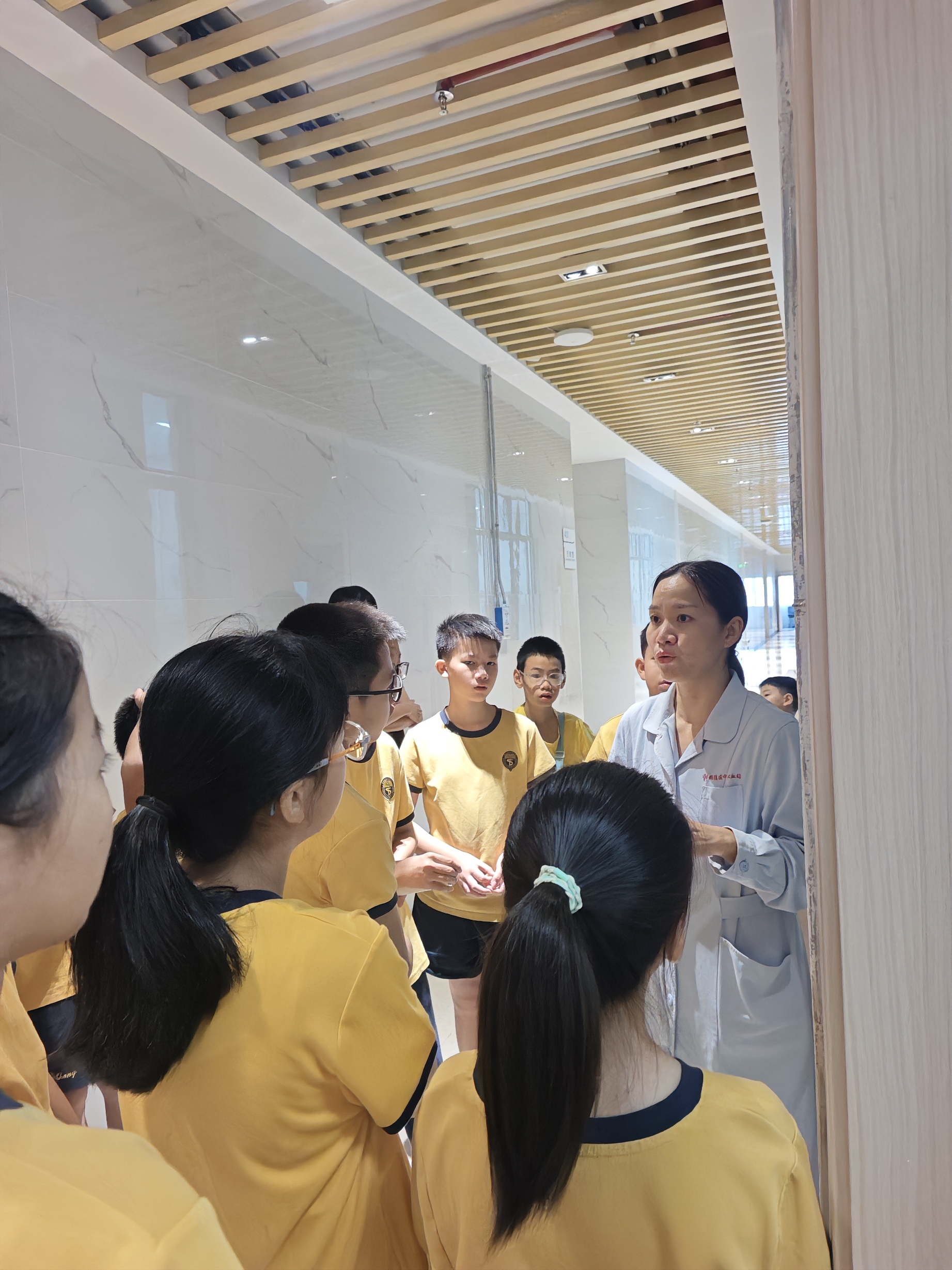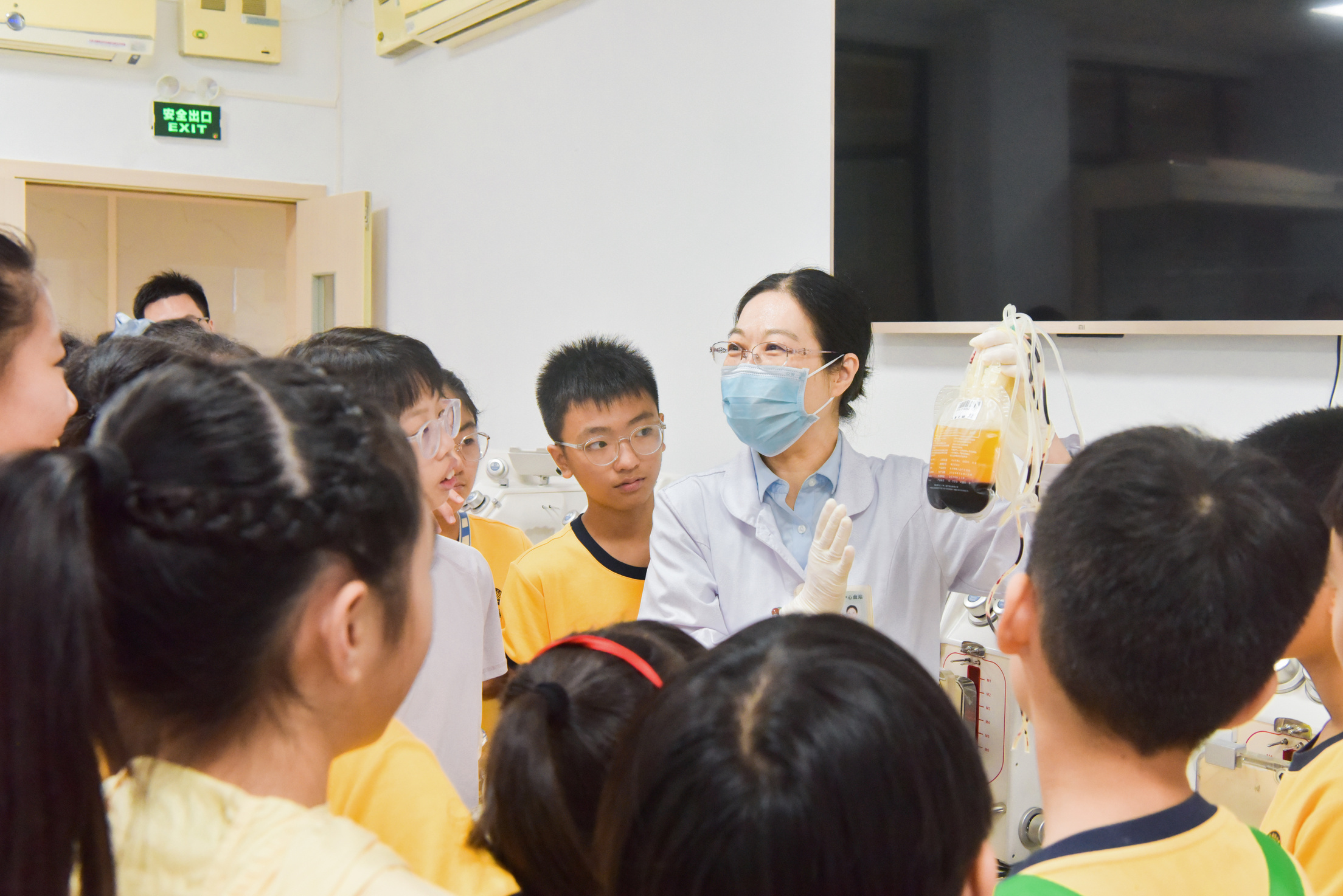 走进血库,学生们立刻被眼前的景象吸引,一排排专业储血冰箱整齐排列,不同血液成分存放在不同温度的专用设备中。