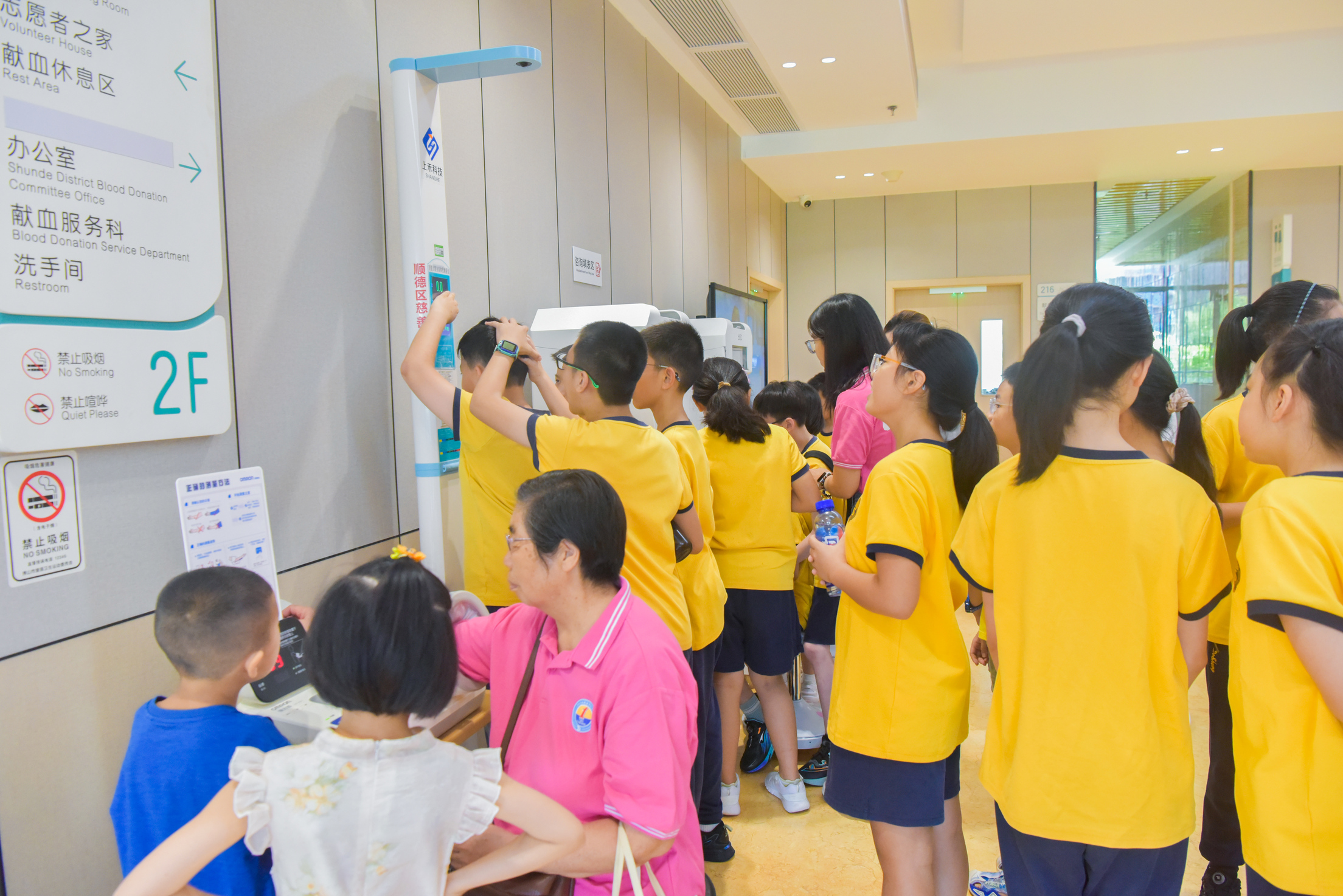 随后,学生们来到了今年刚被评为“2025年全国最美献血点”的区中心血站本部献血点,一走进就让人眼前一亮。在智能化自助体检的献血服务平台前,大家跃跃欲试,亲手操作体验献血体检流程,脸上满是新鲜与好奇。