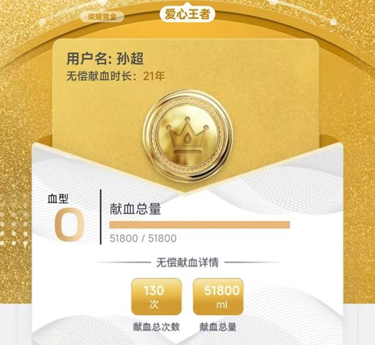 父母从小就在孙超幼小的心灵里播下爱的种子,西铁楷模李军的奉献精神更加激励孙超坚持热血奉献。在捐献10次全血后,孙超开始捐献机采血小板,从不间断。一路走来,从荣获全国无偿献血奉献奖铜奖、银奖、金奖,到终身荣誉奖,孙超满满的荣誉感和社会责任感,他的爱心事迹也在亲友和同事中传为佳话。