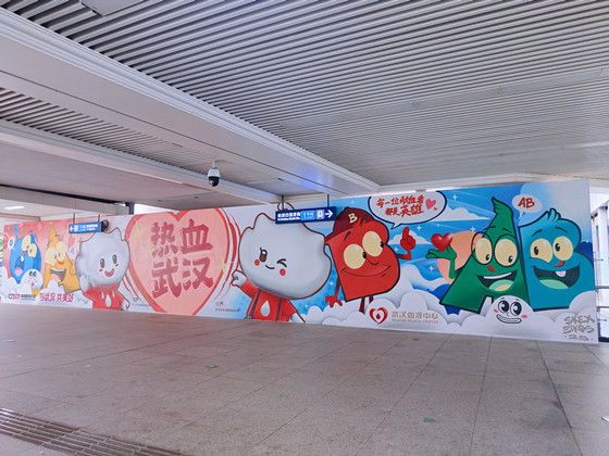 据悉,“英雄红”涂鸦列车将在武汉轨道交通线持续运营一年。恰逢武汉地铁涂鸦艺术季,为营造浓郁的无偿献血公益氛围,武汉血液中心还携手中南地铁传媒在武汉地铁三阳路站内打造了无偿献血主题涂鸦墙打卡点,整个墙面充满了“热血红”元素,,色彩鲜艳的巨型A、B、AB、O血型卡通人物图案跃然墙上,与武汉市无偿献血吉祥物共同绘成“热血武汉”的绚丽图景,期待广大市民前往打卡,共赴“热血浪漫之约”。
