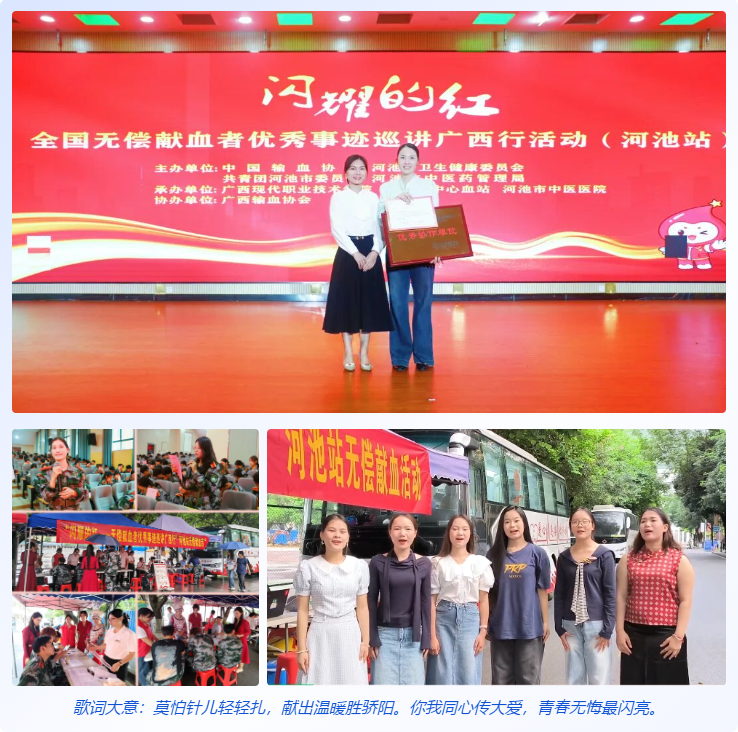 闪耀的红燃动河池,热血青春不负韶华。为让活动更具互动性与趣味性,开启前活动组提前向学生发放无偿献血倡议书,并精心设置科普知识问答环节——凡是积极参与互动、精准答对问题的同学,都能收获专属“热血小礼物”,让知识与惊喜双向奔赴。在随后的无偿献血活动中,许多同学踏雨赶来,主动伸出手臂捐献热血,让自己也化作那抹动人的“闪耀的红”;巡讲团的“明星老师”们更是亲临现场为同学们加油鼓劲,几位广西河池市毛南族同学受到感染后,更是自发跟着工作人员一起唱起了山歌,呼吁大家加入无偿献血队伍,用实际行动传递温暖,守护生命。