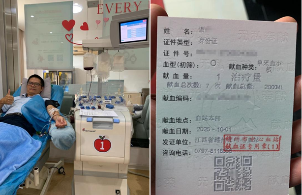 国庆节当天,赣州市中心血站迎来了一位老朋友——献血者谢先生。与以往献全血不同,这次他献出的是一份珍贵的血小板。初次尝试,谢先生激动地拍照留念,镜头定格下的,不仅是一份善举,更是经历风雨后的感恩,还有愈发强烈的责任感。