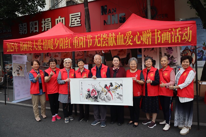 岁岁重阳,丹桂飘香。今年重阳节,南宁中心血站与广西老年大学无偿献血公益行动再续温暖篇章。10月29日,南宁中心血站联合广西老年大学在朝阳捐血屋开展“书画传大爱 情暖夕阳红”重阳节无偿献血爱心赠书画活动。这是自2011年以来,广西老年大学连续第15年组织教授及学员志愿者,以翰墨丹青致敬无偿献血者,传递银龄群体的深情厚谊。