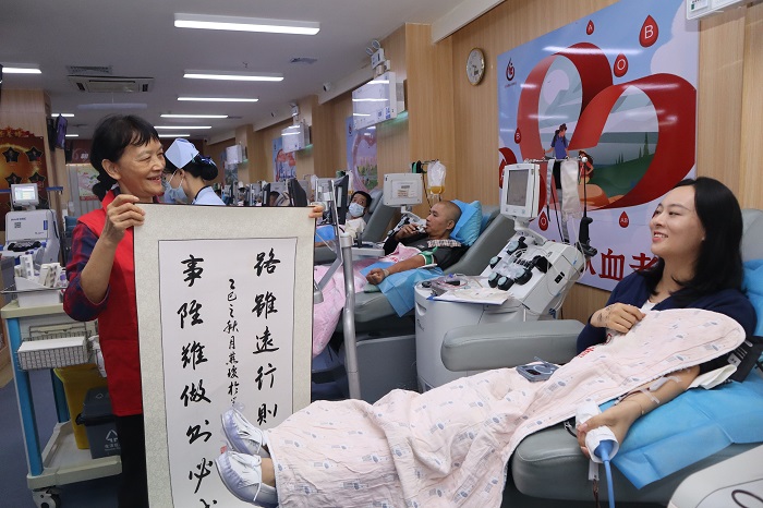 献血者收获老年大学志愿者送出的书画作品