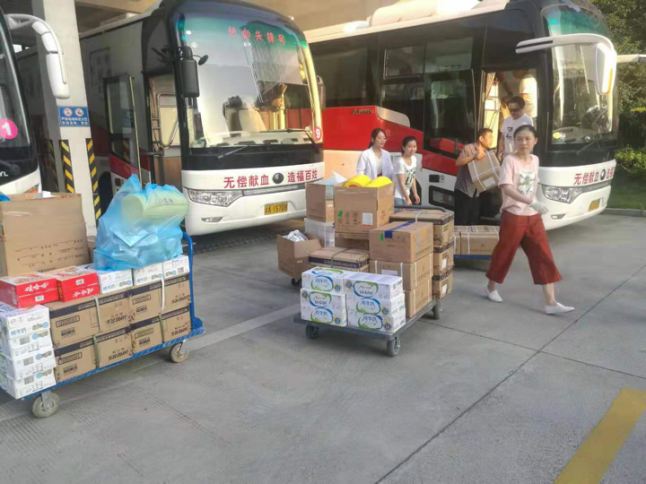 献血服务一科的同志们将一箱箱、一件件仪器设备、采血耗材、纪念品及食品等物资陆续搬上献血车,来回十数趟,汗水已浸透衣背。