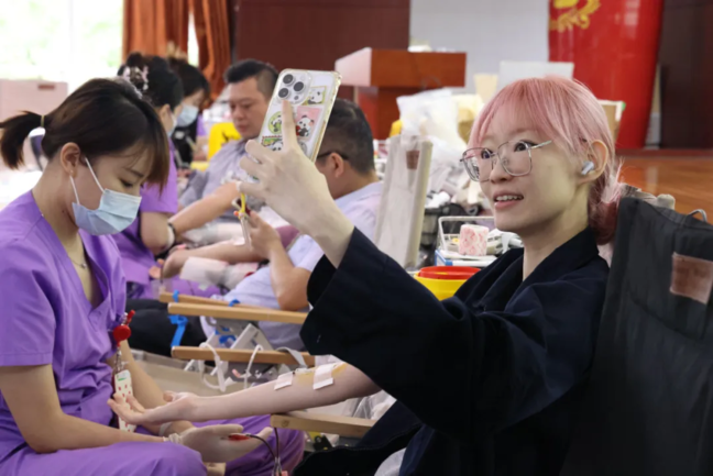 ,一头粉色的头发在人群中显得格外醒目,她举起手机定格这个值得纪念的瞬间,尽显青春本色。随着越来越多员工走进公司,献血区迎来一波又一波爱心献血者,本次参加无偿献血的还有陈启明、李福海、王静静、余丽平等,他们大都是定期献血者,无偿献血早已成为他们健康生活的一部分……