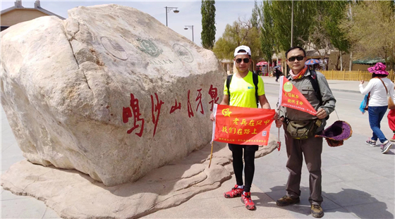 去年4月18日,钟夏文与队员唐白良一起去往敦煌参加沙漠公益徒步,在敦煌的玄奘古路他们持无偿献血和关爱老兵宣传旗帜,背包徒步了108公里,过程中不仅宣传了无偿献血,最后还赢得徒步冠军。