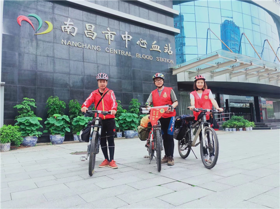 钟夏文(左)唐白良(中)李静(右)骑行至南昌宣传无偿献血