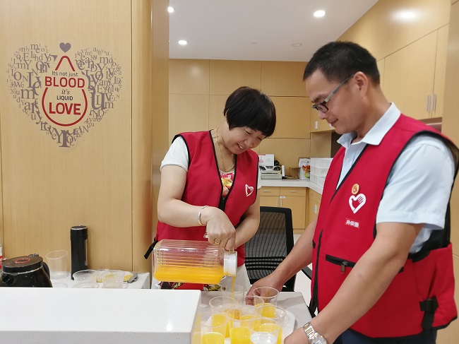 一大早在血液中心做志愿者的向秀芝说:“我家住临平的,早就报名了今天做志愿者,怕台风天路上耽搁,昨晚上都没回家,在女儿家住了一个晚上,早上也是沿着南山路骑电瓶车过来的,我到的时候大厅里已经有好些人了,没想到大家都这么有爱心!”孙荣强是盛全物业下沙德信项目处的员工,他说:“昨晚上在单位值班抗台,今天在中心当志愿者,都是为人民服务!”