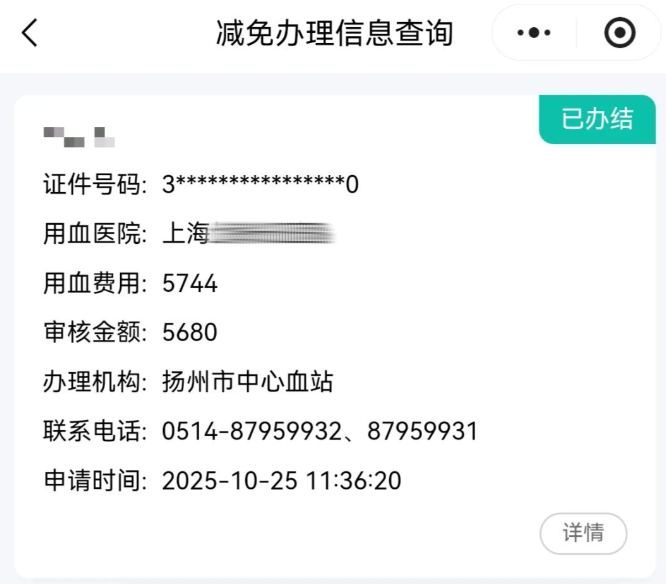 直到2025年10月,一次偶然的机会,他看到“扬州市中心血站”微信公众号发布的血费报销指南,突然想起了自己多年的献血经历。“去年父亲的输血费用,是不是可以凭借献血记录来报销?”带着一丝疑惑,刘焕泉按照指南上的步骤,线上提交了血费减免申请。让他惊喜的是,整个审核流程高效快捷,短短几天内便收到了“已办结”的通知,最终成功报销5680元,几乎是全额报销。
