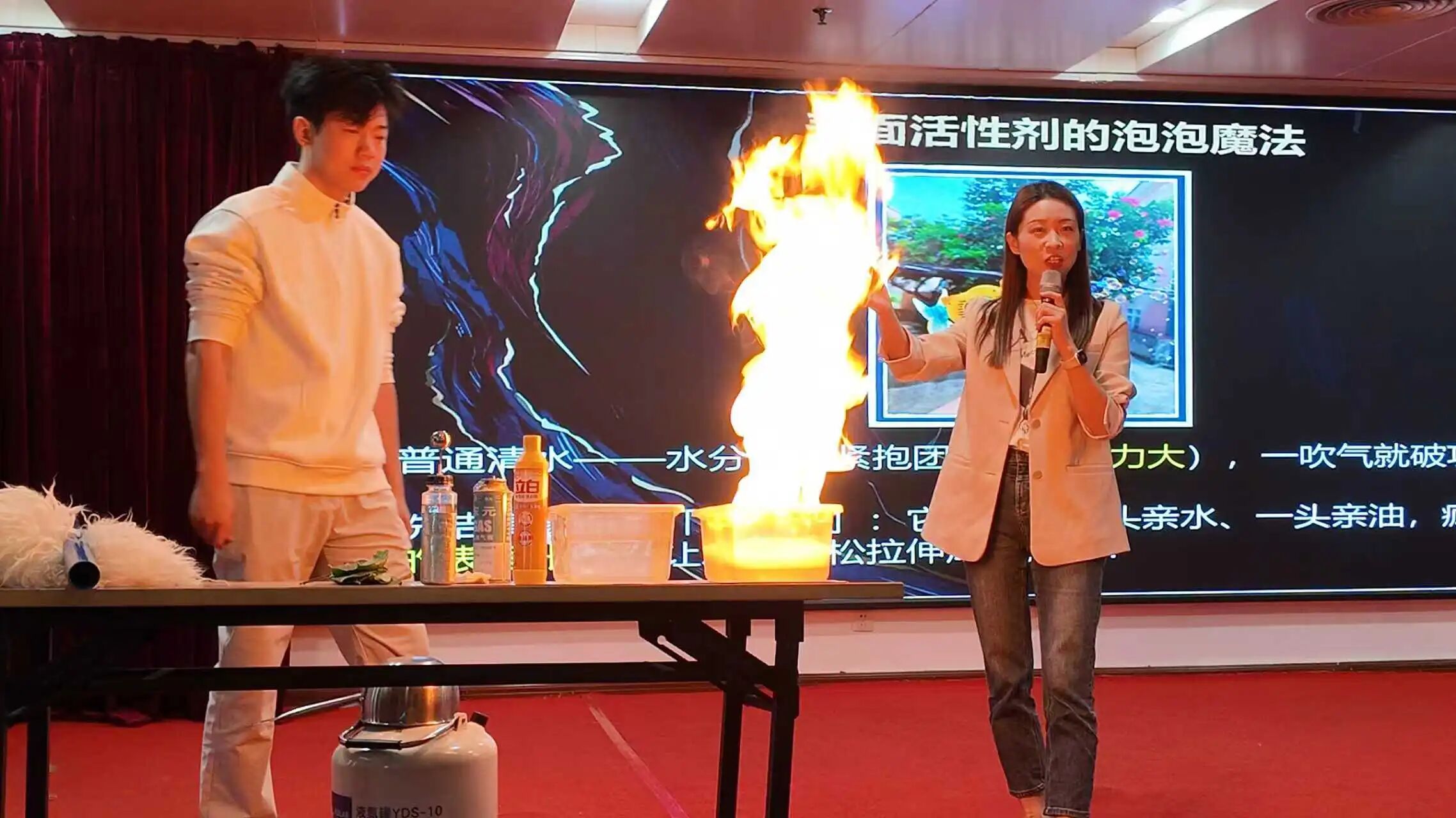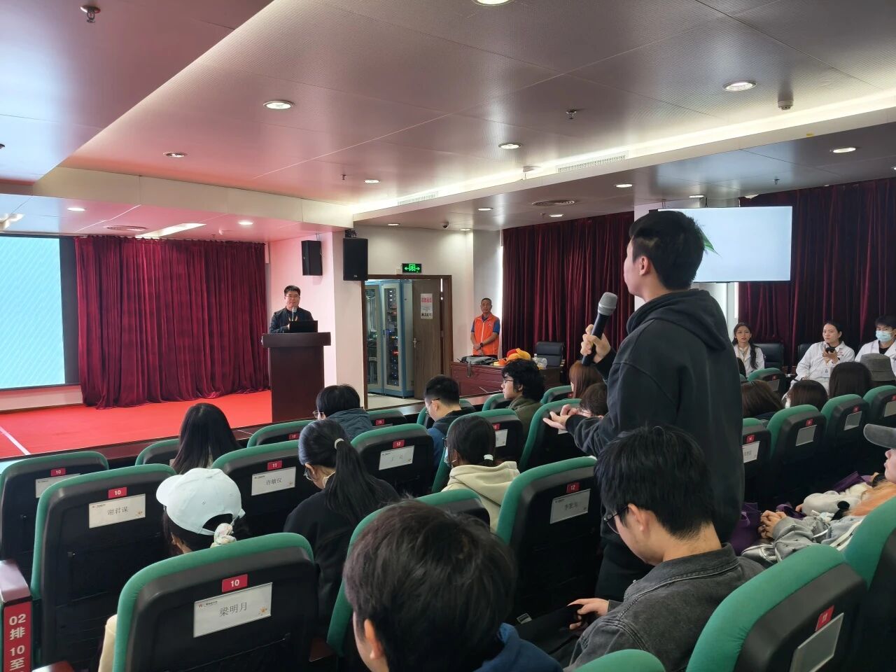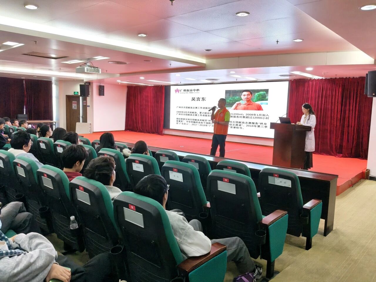 参观结束后,师生们前往中心19楼会议大厅,参与无偿献血主题宣传讲座与科学实验秀。讲座上,宣讲人员以 “无偿献血,点亮生命” 为主题,结合真实案例,从献血条件、献血后注意事项、血液临床应用等方面进行全方位讲解,破除了认知误区;随后的科学实验秀环节,工作人员用趣味实验展示血液中的生命科学,现场互动频繁,师生们积极参与,在轻松氛围中深化了对无偿献血的科学认知。活动特别邀请累计献血331次的无偿献血者吴言东先生现场分享。吴言东先生结合自身经历,讲述了26年的献血历程。自 1999年首次参与无偿献血以来,他始终坚持 “定期献血、公益践行”。他以自身每年体检指标均符合健康标准的实际情况,正面回应师生对“献血影响健康”的担忧,明确表示 “规律献血不仅不会损害身体,反而会促使自己更注重作息、饮食等健康生活习惯”;同时寄语青年学子:“青年是社会公益的中坚力量,希望大家在了解无偿献血知识后,能主动参与其中,用青春行动为生命护航”。朴实的话语与厚重的献血履历,引发现场师生强烈共鸣,掌声持续不断。