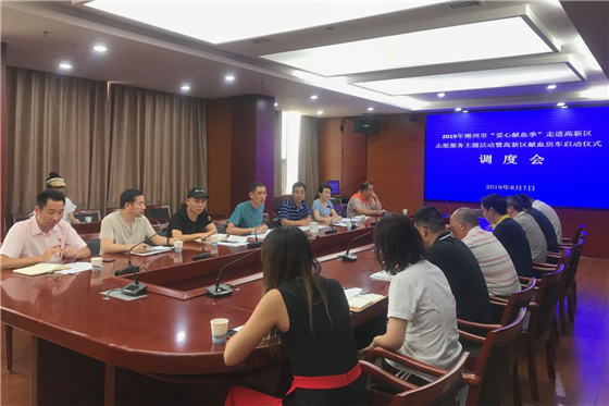 ●8月7日,高新区召开2019年郴州市‘爱心献血季’走进高新区志愿服务主题活动暨高新区献血房车启用仪式调度会,高新区管委会、郴州市中心血站、郴州市志愿服务联合会相关负责人及园区厂企代表参会,部署活动有关工作,共为推进高新区无偿献血工作和精神文明建设献言建策。(李孟玲/摄)