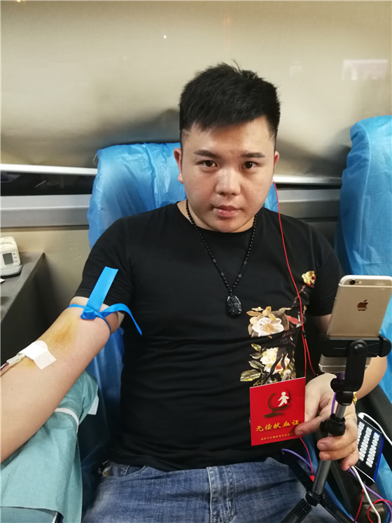●8月12日晚,郴州市民郑小文参加无偿献血,并在某网络平台直播献血过程。郑小文说,过去很多流言都认为献血有害健康,即使现在无偿献血科普知识宣传更多了,也还有很多人认为献血不安全。通过直播,可以让很多人清楚看到我们献血环境的干净、卫生、整洁,号召更多有爱心的人参与这项公益事业。(郭思圆/摄)