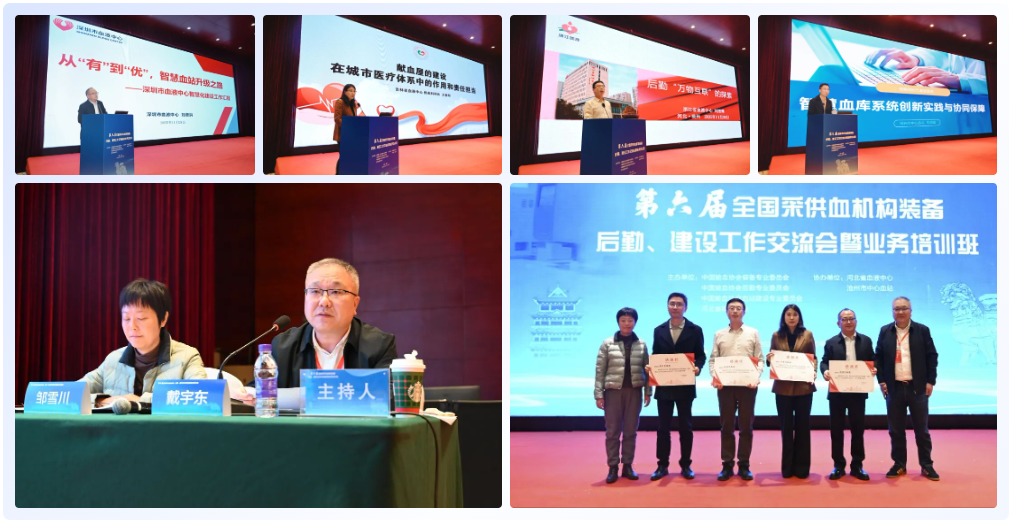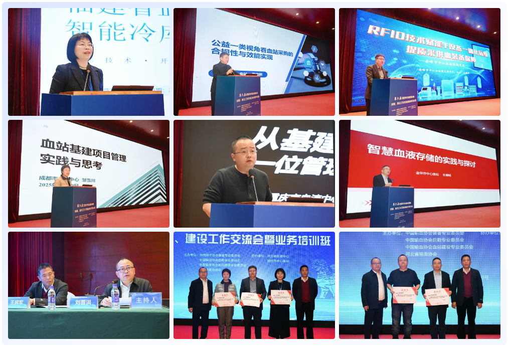 协会建设委副主任委员、福建省血液中心党委书记、主任陈婷作题为《福建省血液中心智能冷库建设的思路与设计》的报告。协会后勤委副主任委员、襄阳市中心血站副站长曹志刚作题为《公益一类视角看血站采购的合规性与效能实现》的报告。协会管理委委员、协会理事、赤峰市中心血站站长王鹏坤作题为《RFID技术赋能+设备一体化运维提质采供血装备保障》的报告。邹雪川作题为《血站基建项目管理实践与思考》的报告。协会建设委委员、重庆市血液中心后勤服务科科长陈煜作题为《从基建攻坚到后勤保障:一位管理者的实践与思考》的报告。协会建设委副主任委员、协会理事、金华市中心血站党支部书记、站长杜晓明作题为《智慧血液存储的实践与探讨》的报告。刘晋洪,协会装备委副主任委员、浙江省血液中心业务部主任王拥军担任本环节学术主持并为讲者颁发感谢状。