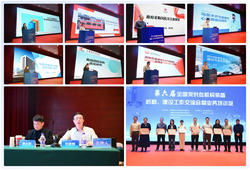 协会装备委青委、江苏省血液中心条件保障科副科长张蕊作题为《PDCA管理模式在血液中心采购管理中的应用实践》的报告。协会建设委青委、武汉血液中心江梦天作题为《献血点的改造及建设——以武汉血液中心一街头献血屋为例》的报告。协会后勤委青委、广州血液中心后勤设备管理部部门主任欧代校作题为《政府采购风险及注意事项》的报告。协会装备委青委、乌鲁木齐市血液中心武凯作题为《乌鲁木齐市血液中心发展建设》的报告。协会建设委青委、安徽省血液中心综合保障中心副科长夏亚莉作题为《安徽省血液中心新站建设实践与思考》的报告。协会装备委青委、东营市中心血站张艳敏作题为《血站招标采购优化研究》的报告。协会建设委青委、深圳市血液中心后勤服务部副部长张耿作题为《UPS电源的智能化管理及可靠性提升研究》的报告。协会建设委青委、浙江省血液中心总务科副科长金立明作题为《BIM 技术在血站建设中的应用探讨》的报告。刘晋辉,曹志刚担任本环节学术主持并为讲者颁发感谢状。
