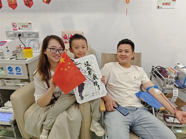 安静地坐在献血椅上,身旁是他温柔的妻子和懵懂可爱的儿子。看着血液缓缓流入血袋,他的脸上没有紧张,只有平和的满足。在这个庄严的节日里,他们以这种安静而深刻的方式,献上一份独特的礼物。滚烫的热血,连接起生命的通道;小小的红旗,飘扬着家庭的信仰。