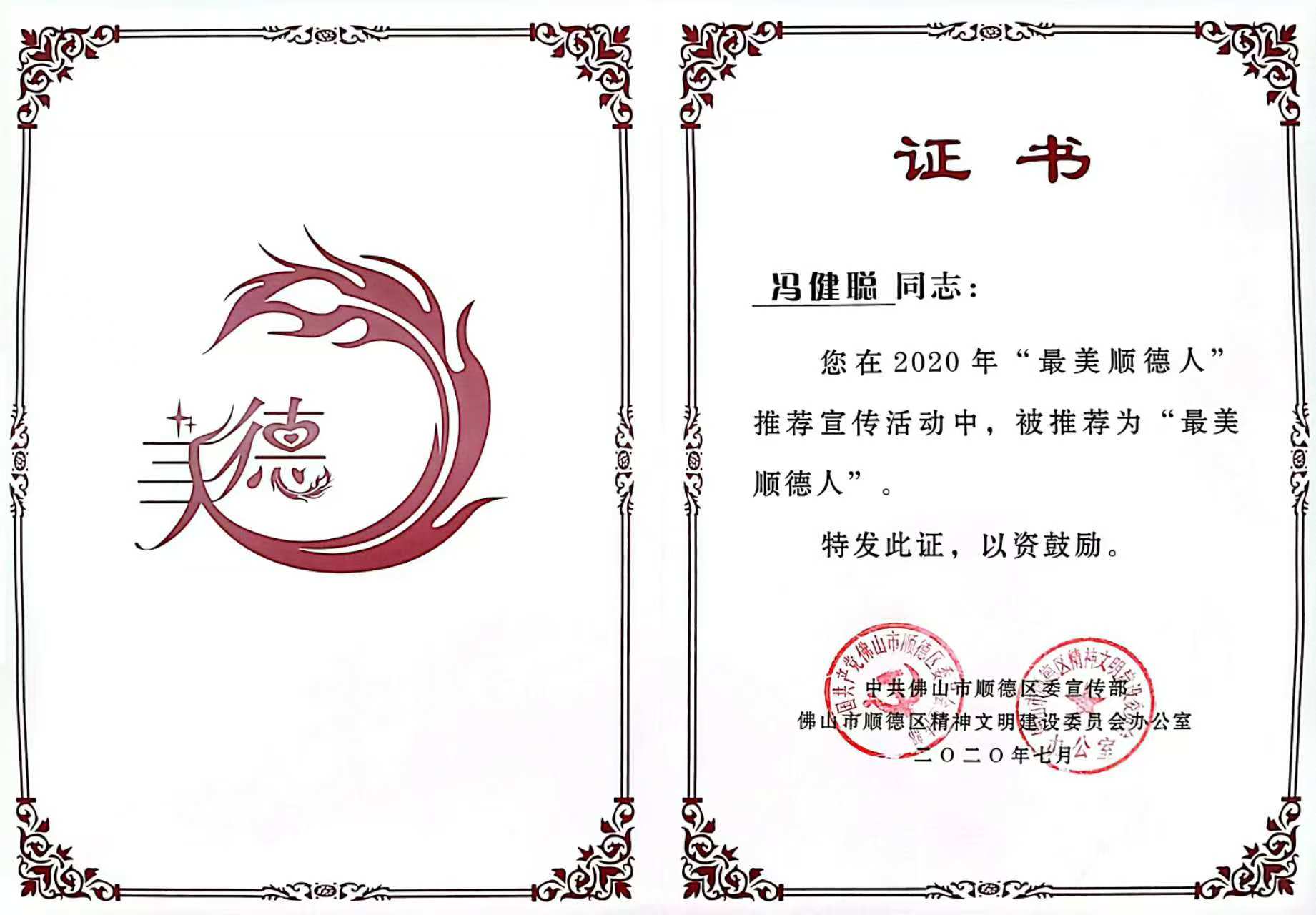 2020年武汉疫情爆发时,冯健聪主动请缨奔赴一线,参与“新冠病毒”危重症患者的救治支援工作;归来后,他将这份“舍己为人”的精神延续到献血事业中,“抗疫是守护生命,献血也是守护生命,只要能帮到别人,再累也值得”。这份坚守让他先后荣获“2020年最美顺德人”“2020年顺德好人”等称号。